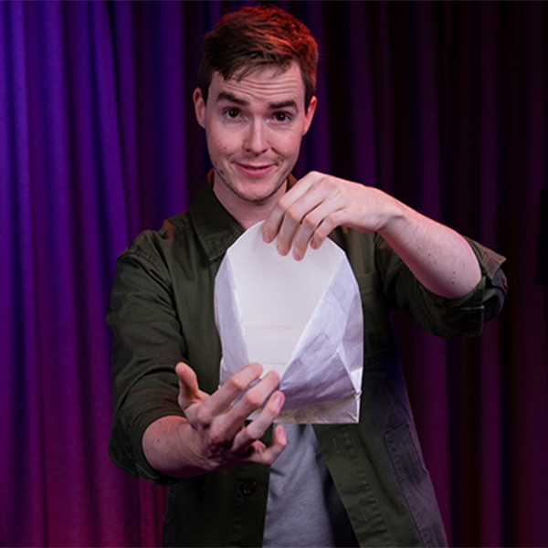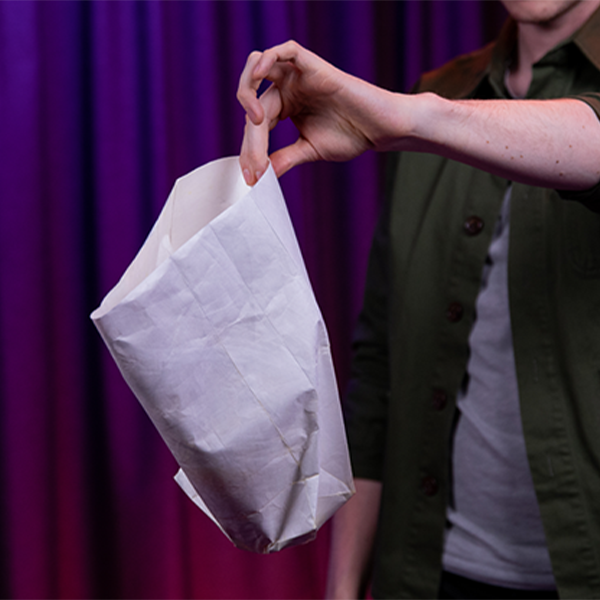 Sacas una bolsa doblada de tu bolsillo y la despliegas delante del público.